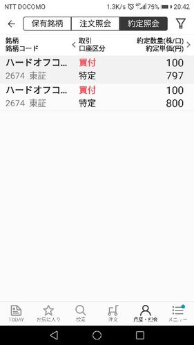 本日の約定はこちらです。 ハードオフもとうとう1000株になってしまいました。 ハードオフ、しばらくは購入は控えます。 日本株保有の状況はこちらです。 オリックス NTTドコモ は、権利落ち後すぐに復活しましたが、 ハードオフ 盟和産業 東海リース は、下…