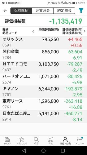 今日もちょっぴり上がりました。 日本株の保有状況はこちらです。 オリックス NTTドコモ キヤノン 日本たばこ産業 と 比較的保有率が高いものが、上がりました。 オリックスはまた含み益になりました。 NTTドコモ キヤノン 日本たばこ産業 は戻りは弱いです…