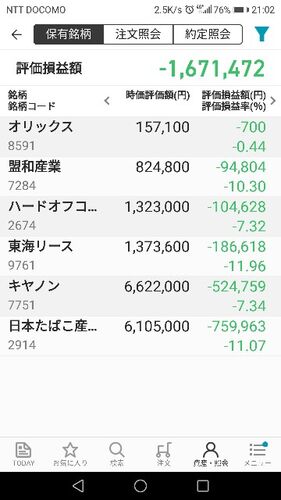 日本株の保有状況はこちらです。 オリックス 決算が悪かったので、下がりました。 含み益が無くなりました(T_T) ハードオフ 決算はそんなに悪くないのに、下がりました。 キヤノン、オリックスが下げたので、注文しました。 約定ならず。 政府が何も出来ない…