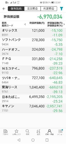 日本株の保有状況です。 前日よりマイナス210000円です。 ヤバイ、あと少しで、また含み損700万円突破してしまう。 決算が発表されてますが、 やっぱり悪いですよね。 コロナだけのせいではないと思いますが、 元々、景気後退の足音が聞こえていたのでは…