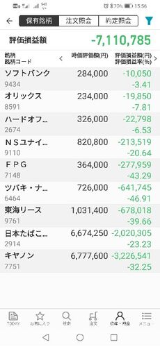 日本株の保有状況です。 前日よりマイナス5051円です。 今日は日本たばこ産業が頑張ってくれました。 あと、FPGとオリックスが下げ止まらないので、 ナンピン。 もうちょっと下値を狙えばよかったかな。 FPGは上場来安値を更新してしまった。 金融関係は厳し…