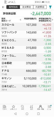 日本株の保有状況です。 前日よりマイナス308500円です。 本日は大暴落でもなく、下落でもなく、暴落ですかね。 久々に保有株全面安でした。 新規銘柄購入チャンス。 ナンピンチャンス。 かと思いましたが、 狙っている銘柄が思ったよりも下がらなかったな。…