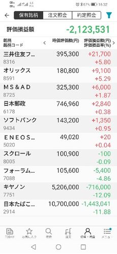 日本株の保有状況です。 前日よりプラス558639円です。 個別に見ていくと。 三井住友フィナンシャルグループ 上がりました。 オリックス 上がりました。 MS&AD 上がりました。 日本郵政 上がりました。 ソフトバンク 上がりました。 ENEOS 上がりました…