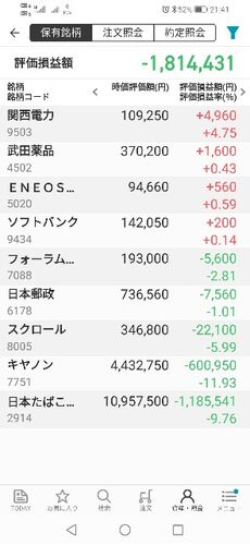 日本株の保有状況です。 前日よりマイナス15340円です。 場が開けた時は10万円超えて安くなっていましたが、終わりには、マイナスが縮小していました。 今日も動かずというかやる気が無く、朝一度しか株価チェックしませんでした。 まあ、強いて言えば関西電…