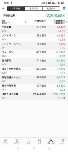 日本株の保有状況です。 本日の約定はこちらです。 今日は日経平均株価も保有株も下がりました。 日本たばこ産業、ナンピンしました。 あと少しで株価2000円切りそうです。 日本特殊陶業、ナンピンしました。 このところ調子悪いですね。 結局含み損200万円…