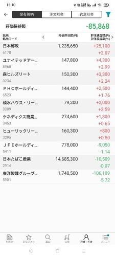 日本株とリートの保有状況保有状況です。 本日の約定はこちらです。 今日は日経平均株価は上がりましたが保有株は下がりました。 日本たばこ産業が連日上がっていましたが、今日は流石に下がりました。 結局、保有株含み損で終わりました。 金曜日だし、こん…