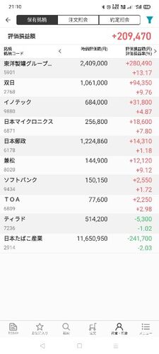 日本株の保有状況です。 本日の約定はこちらです。 今日も日経平均株価は上がりましたが、保有株は下がりました。 JT調子悪いです。 ナンピンしました。 その他の銘柄が頑張って、含み益をキープしていますが、風前の灯です。 他の銘柄の保有率を上げない…