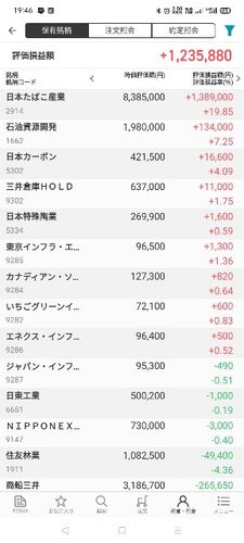 日本株の保有状況です。 先週よりプラス1158600円です。 個別に見ていくと。 (インフラファンドは安定的なので省略します。) 物価連動米国債ETF 損切りしました。 分配金が安定的に支払い無い事が分かったので。 日本たばこ産業 大爆上がりしました。 …