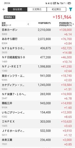 ランキング参加中株式投資・FX・マネー 経済動向語り合おう! 日本株の保有状況です。 先週よりプラス83,148円です。 個別に見ていくと。 日本カーボン 上がりました。 あおぞら銀行 上がりました。 NF S&P500 上がりました。 NF J-REIT 上がりました。 東京…